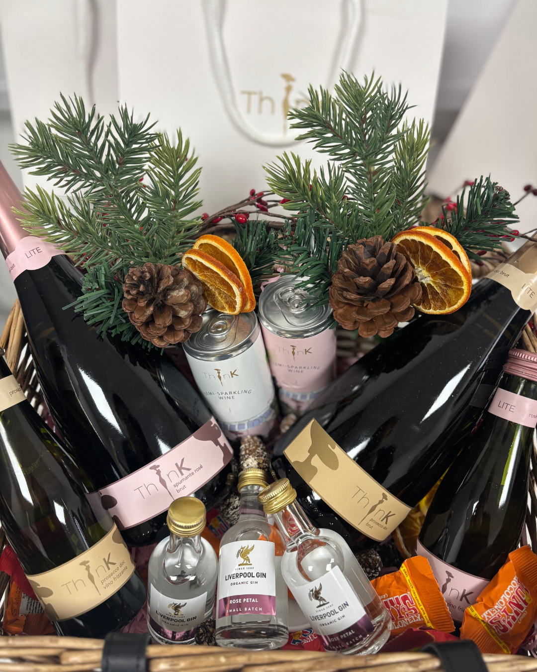 Complementing the fizz, we’ve included Liverpool Gin miniatures, 2x ThinK Wine Flutes, premium chocolates, and seasonal garnishes to complete the experience all nestled in a beautifully hand-finished wicker basket adorned with pine, dried orange, and berries for a touch of Christmas luxury.
