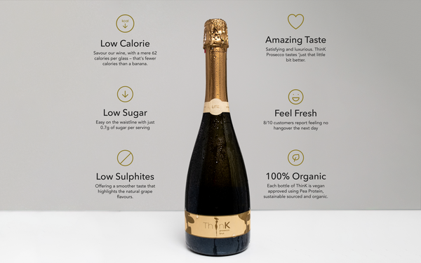 Sip and savor the deliciousness of ThinK prosecco, where we've carefully crafted a drink that's not only delightful but also healthier. Compared to your typical glass of prosecco, ours has an impressive 50% less sugar! So, you can enjoy every bubbly sip without worrying about excess sweetness. With ThinK prosecco, you get all the flavor and fun, but with a significant reduction in sugar.
